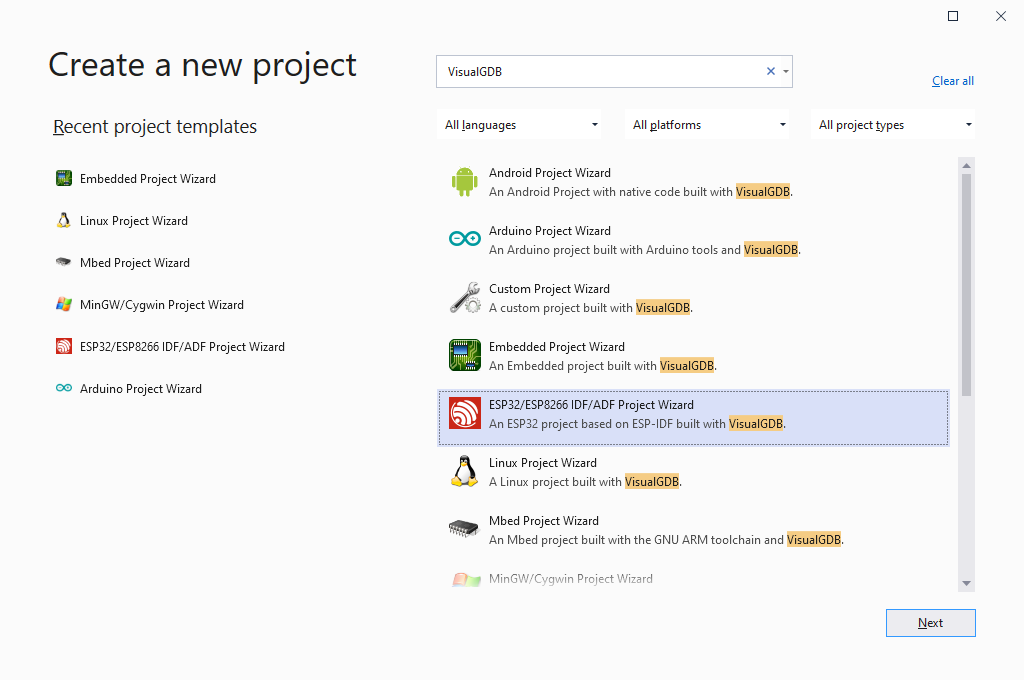 - Start Visual Studio and locate the VisualGDB ESP-IDF Project Wizard: