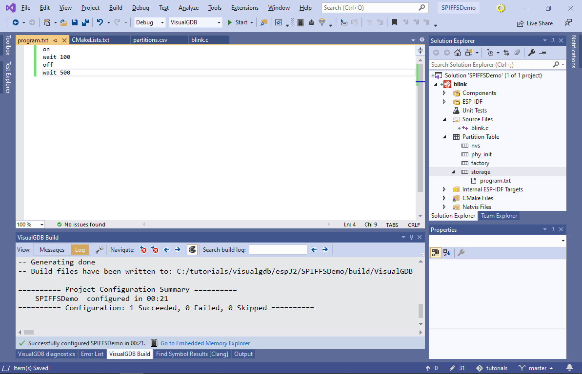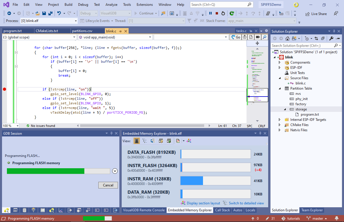 Remove the breakpoint and resume debugging. The LED will now blink in shorter impulses with longer pauses. - The SPIFFS partition can be rebuilt and programmed separately from the program itself. Try changing “wait 100” to “wait 1000” and then build the “storage-flash” target: