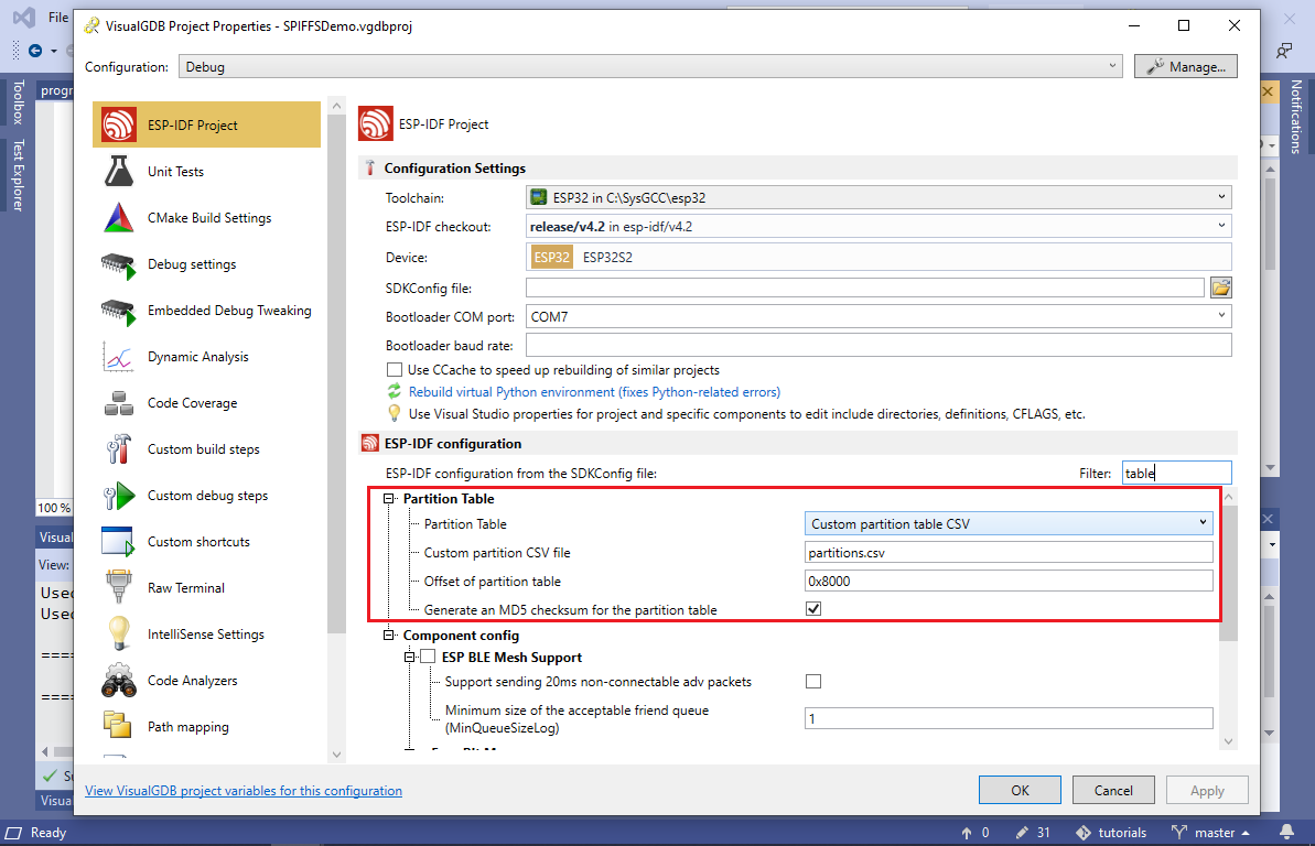 - VisualGDB will copy the default layout file (partitions.csv) to the project directory and will configure the project to use it. You can change this setting later via VisualGDB Project Properties: