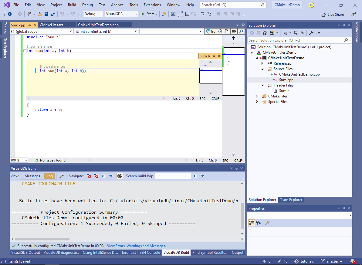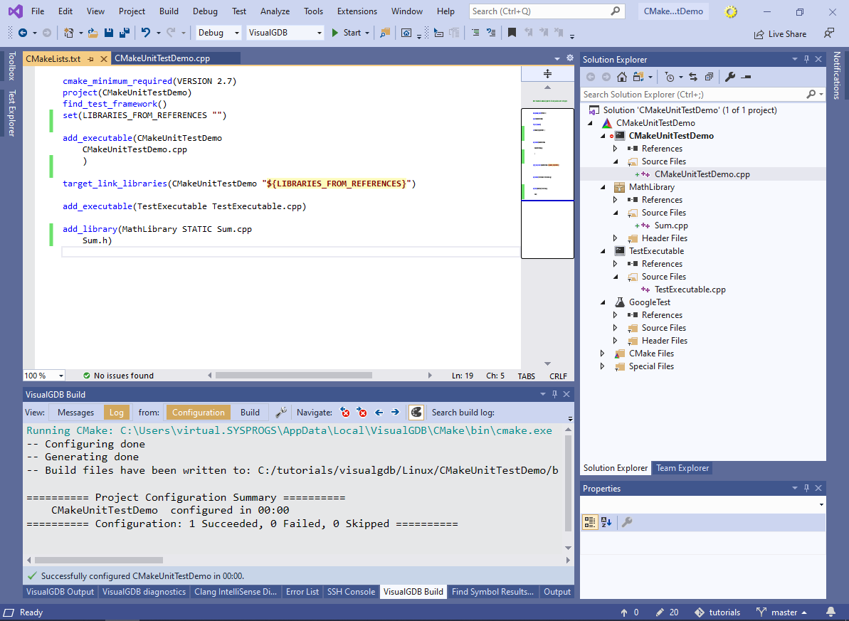 This tutorial shows how to add unit test targets to Advanced CMake projects. Unlike the Make-based, or MSBuild-based projects that are limited to one target per project, Advanced CMake projects can contain multiple targets (i.e. executables and libraries). This greatly simplifies the project structure: