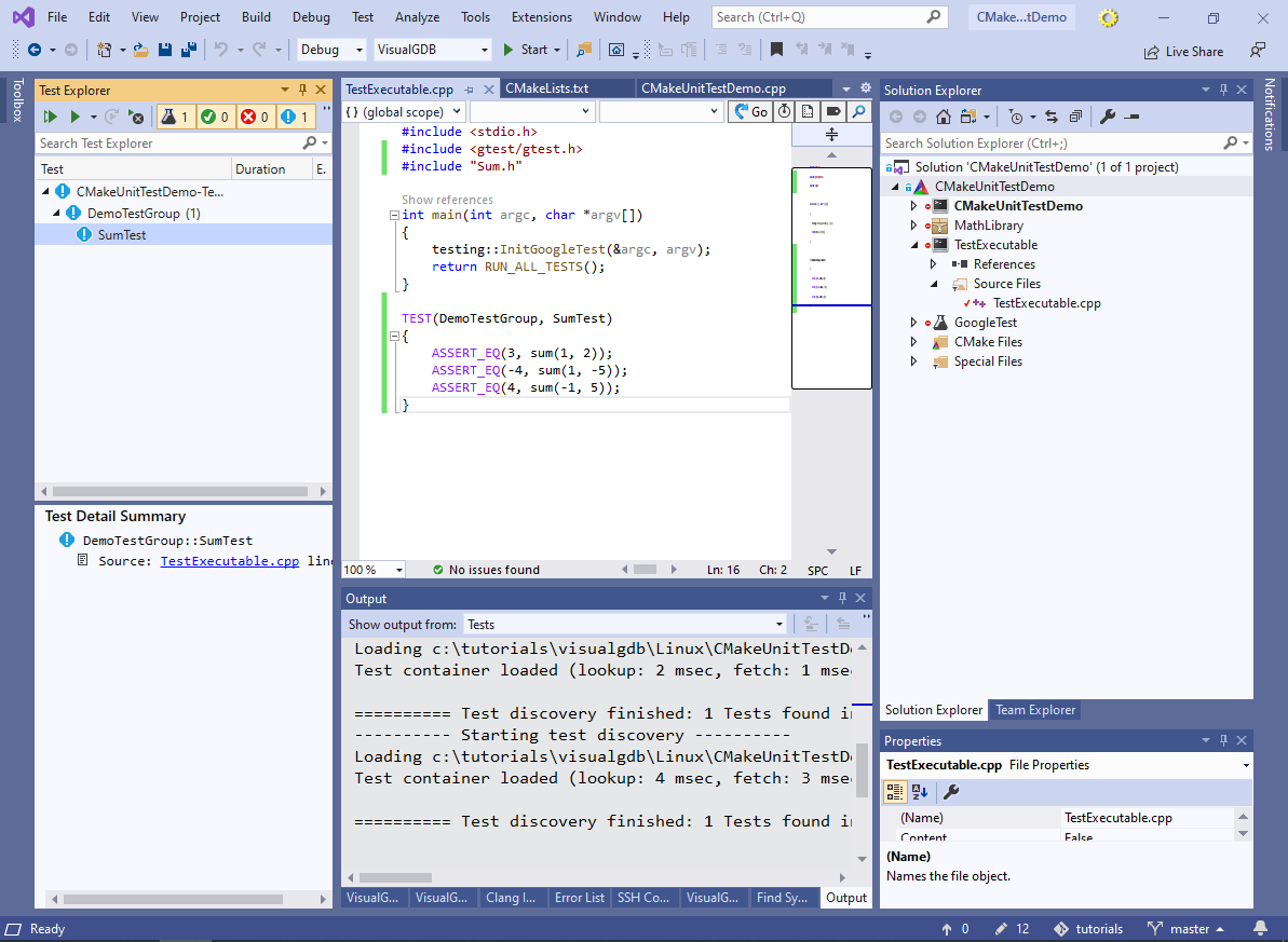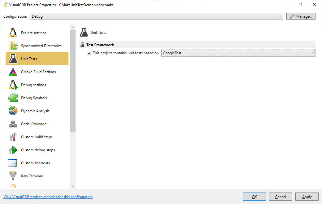 Now we have created a basic executable consisting of a testable sum() function and the main() function calling it. Verify that the project builds successfully by selecting Build->Build Solution. - Now we will show how to split the project into a main application, testable library, and a unit test executable. Open VisualGDB Project Properties and reference the GoogleTest framework via the Unit Tests page:
