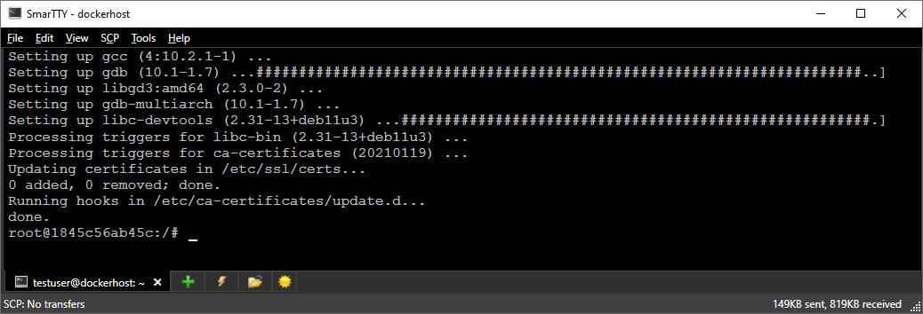 - Once the container is running (note the root@<ID> prompt), run the command below to install the ARM cross-toolchain and a few other tools: