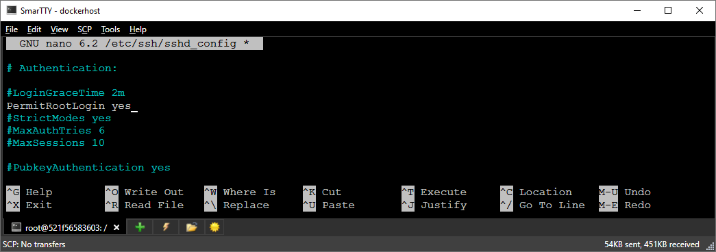 - In this tutorial we will configure the container to run an SSH server, so that we could connect to it like it was a regular Linux machine. To facilitate that, you would need to either add a new user (with the “adduser” command) or configure the SSH server to allow connections from root. Since this is an isolated container anyway, we will proceed with the second option. Open the /etc/ssh/sshd_config file in nano: