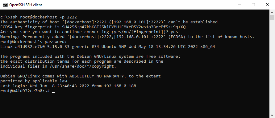 - Now we can delete the old container (since it was converted to an image) and create a new one based on the new image and having the SSH port redirected to port 2222 on the host: