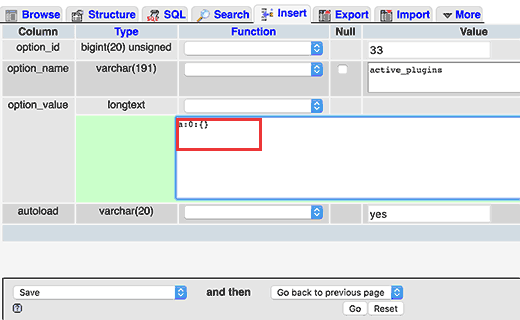 On the next screen, you will need to change the option_value field to a:0:{}and then click on Go button to save your changes.