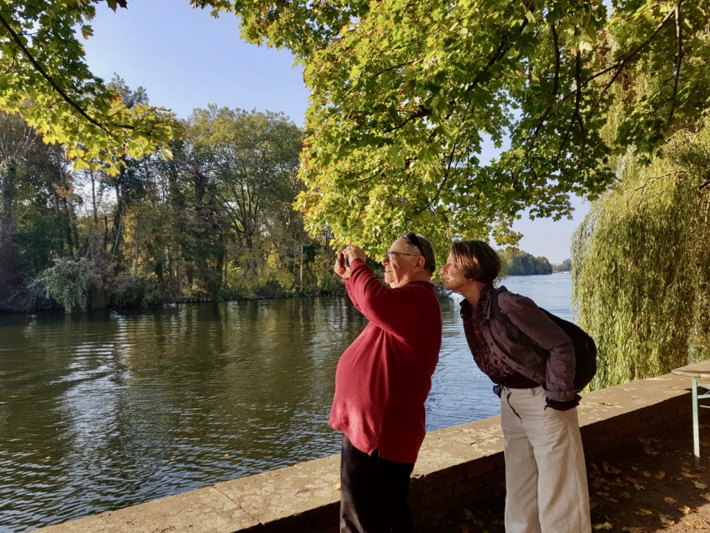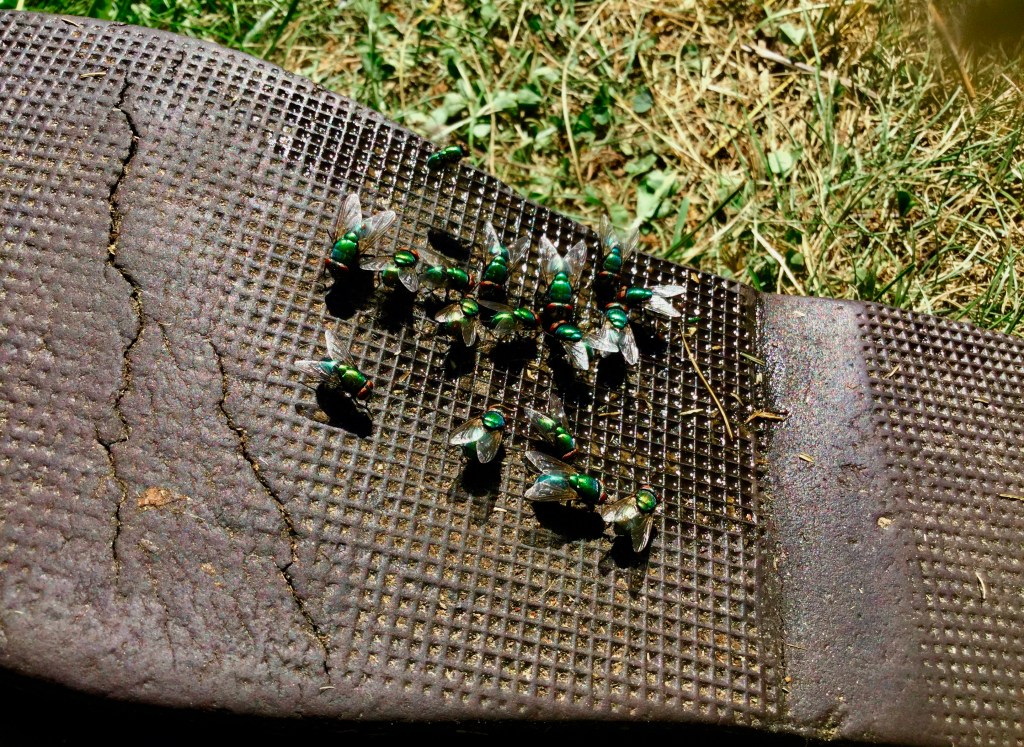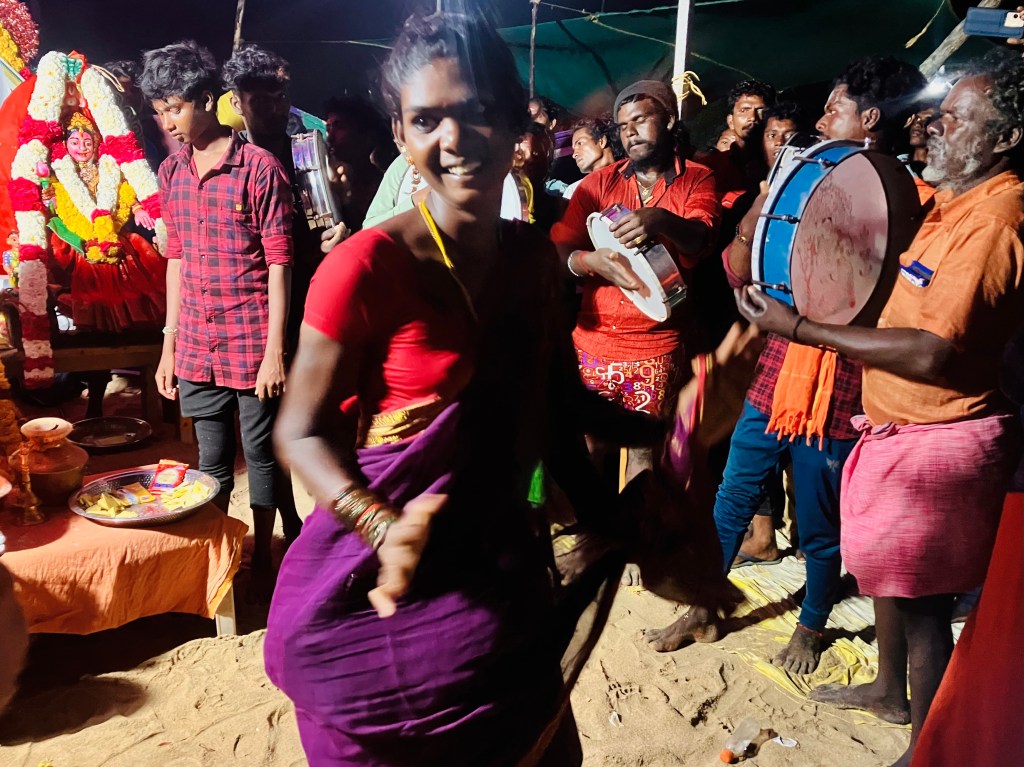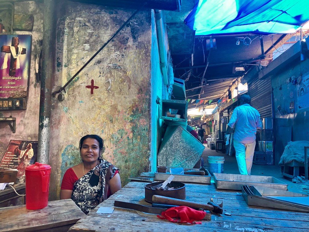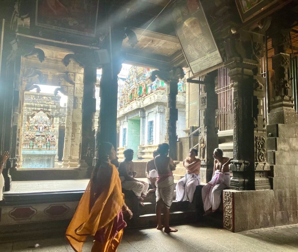 Die Hunde schlafen noch. Der Bügler putzt sich die Zähne und geht ein paar Schritte vor seinem Laden auf und ab. Am städtischen Container stehen Hausfrauen, Mägde, Alte, Krumme und Kerle mit Mopeds an, um Metallkaraffen und Plastikbehälter mit aufbereitetem Trinkwasser zu füllen, das dort zwischen 6 und 8 aus einem Hahn fließt. Die Nachbarin malt mit weißem Farbpuder einen Kolam vor ihre Türschwellen. Sie hat den Boden mit einem Reisigbesen gefegt und mit einem Eimer Wasser den Staub weggespült. Die Hunde strecken sich den ersten Sonnenstrahlen entgegen, dann dösen sie weiter. Sie haben die halbe Nacht lang im dorfweiten Jaul- und Kläffkonzert von wohl Hunderten anderen Strassenhunden mitgebellt. Unter einem gelb blühenden Trompetenbaum hebt die alte Frau im Hof die Arme zum Sonnengruß. Hinter der ausgebleichten Wellblechverkleidung liest der Bügler auf seinem Arbeitstisch die Tageszeitung, im Kohlebecken liegt weißgraue Asche, später wird er sein eisernes Bügeleisen daraus mit Glutstückchen beheizen. Im Kerala-Teestand gegenüber dem Shiva-Tempel presst der dünne junge Teeboy von der fernen Küste des arabischen Meeres Orangen aus. Er serviert den randvollen Plastikkelch mit Papierstrohhalm im aufgeschäumten Saft formvollendet und mit einem mühsam artikulierten „Orangejuice!“. Das ist nach „tea-a“ sein drittes englisches Wort. Für einen Moment blitzt ein Leuchten in seinen kuhäugigen Blick. Wenn ihn die Verlorenheit übermannt, spielt er muslimische Musik oder Gebetsgesänge laut über sein Handy ab, gegen die dröhnenden Mantras aus den Lautsprechern des Tempels hat er keine Chance. Manchmall singt er leise vor sich hin. Zum Neumond wird der Eingang des Shiva-Tempels mit einem goldgerüschten Baldachin drapiert. Darüber bilden Hunderte von bunt flimmernden Leuchtdioden an einem Gerüst aus Bambusstreben ein Bild Shivas bei seinem „cosmic dance“ mit pinkzuckenden Lotosblüten und fontänenspeienden blauen Elefanten zu seinen Füßen. Im Sri Sai Rai Guesthouse neben dem Tempeleingang sind die schmiedeeisernen Gitter an Fenstern und Tür verstaubt und hochgezogen, das Bordell mit nur einer Bediensteten hat seit langem geschlossen, der Zuhälter, der mit Mundschutz und im weißen Hemd den Eingang hütete, ist verschwunden. Eine Kuh mümmelt sich durch einen Haufen frischer Blumenkohlblätter, die der Gehilfe vom Gemüseladen auf die Straße gekippt hat. In der Clinic von Dr Anathi huscht eine Patientin hinter den brokatenen Vorhang, die Metallbänke im offenen Warteraum sind leer. 500 Rupien kostet die Konsultation. In der Apotheke gegenüber gibt es die Medikamente ohne Schachteln abgezählt in Blisterverpackungen, alles „übern Ladentisch“: da brauchst du Rezept, wieviele willst du, zehn? Die Tabletten werden in grauen, aus alten Rechenbuchseiten zusammengeklebten Tütchen gereicht. Der Guru auf seinem Betonsack sitzt das grelle Mittagslicht in einer Nische unter einer Treppe aus. Ein Mann mit hochgeschlagenem Lungi schiebt sein klappriges Fahrrad, am Lenker hängen große Einkaufstaschen voll Windrädchen in Zellophanverpackungen. Der Wind wird sie spätee mit all dem anderen glitzernden Plastikabfall über den weiten Sandstrand wehen. Große Schildkröten, so alt wie ich, liegen in verschiedenen Stadien der Verwesung am Meeresrand. Wurden sie von unserem Müll erstickt? Unter Wasser, in den Schleppnetzen der größeren Fischerboote, so erzählen die Ortskundigen, können sie nicht länger als eine halbe Stunde überleben, manchmal begraben die Fischer sie. Ein handvoll Frauen in Neonwesten leeren die Mülleimer auf einem Pick-up der Stadtverwaltung und sortieren ihn dabei in verschiedene Säcke. Essensreste werden für die Kühe, Hunde und Katzen an Ecken und am Wegrand hingeleert. Die Krähe holt sich ihren Reis vom Pfosten der Gartenpforte. Eine Ziege mit fünf Jungen schlendert zwischen Menschen, Autos und Mopeds hindurch und findet in Schutthaufen noch etwas zum grasen. Obwohl es jedes Jahr DutzendeTote durch Hundeattacken gibt, sind sie wie alle Lebewesen geschützt, niemnd darf ihnen etwas zu Leide tun. Als vor kurzem ein Hund ein Neugeborenes in einer Klinik von Delhi zerfleischte – eine Schwester hatte aus Versehn ein Fenster offen gelassen – wurde erneut bestätigt, dass Menschenrechte nicht über Tierrechten stehen. Ein Mann spült im Rinnstein ein paar Becher aus und schrubbt einen verbeulten Metalltopf mit Stahlwolle und etwas Seife blank. Bei Nellai Hardware sind Rollen mit neongrünem Maschendraht eingetroffen. Ich sitze mit einem Glas Milchtee im Schatten einer Ladenmarkise auf dem Rinnstein. Der mit Goldbordüren verzierte weiße Lungi eines Manns mit gllänzenden Speckrölchen duftet nach frisch gewaschenen Laken. In der Bude an der Ecke zum Krishna-Tempel rührt der Betreiber einen großen Topf mit siedenden roten Zwiebeln und Koriander um, seine Frau bepudert flachgeklopfte dreieckige Teigstücke mit Mehl, auf engstem Raum auf dem Boden kauert eine erstaunlich bewegliche alte Frau, die Mutter?, und schält mit bloßer Hand eine große Schüssel gerade gekochter Kartoffeln, frische Samosa in einer halbem Stunde, vielleicht. Auf einem Moped fahren drei junge Männer vorbei, jeweils mit einer grünen, schwarzen und orangefarbenen Haartolle. Ein Herr mit ergrauten Koteletten und Bartstoppeln trägt eine leicht welke Jasmingirlande im künstlichen Zopfhaar, zwischen dem Oberteil seines saphirgrünen Saris und einer Hautfalte lugt ein weißer Bh hervor, er schabt die Krümel vom Gebäckblech in seine Hand und erhält seinen Tee umsonst. Hijras, Transvestiten, Männer in Frauenkleidern, Frauen in Männerkörpern, sie betteln nicht, sie fordern Almosen ein mit rauen Stimmen und Armreifengeklirre, fast überall bekommen sie was, sie zeigen keine Dankbarkeit, nicht die Beschenkten, der Gebende ist der Gesegnete, du weißt das alles. Im Restaurant desinfiziert sich ein Tourist mit einem Gel die Hände gegen die undichtbaren Gefahren 