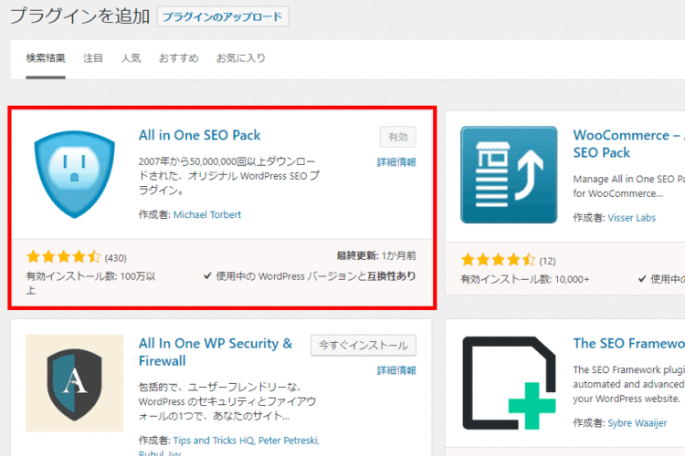 まずは、All In One SEO Packプラグインをインストールしましょう。管理画面からインストールできます。