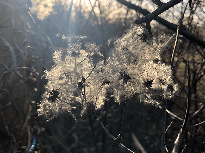 I take a photo of old mans beard, glinting in the sun. On the way back take a different photo for S: green fields, blue sky. Try to make him miss home.