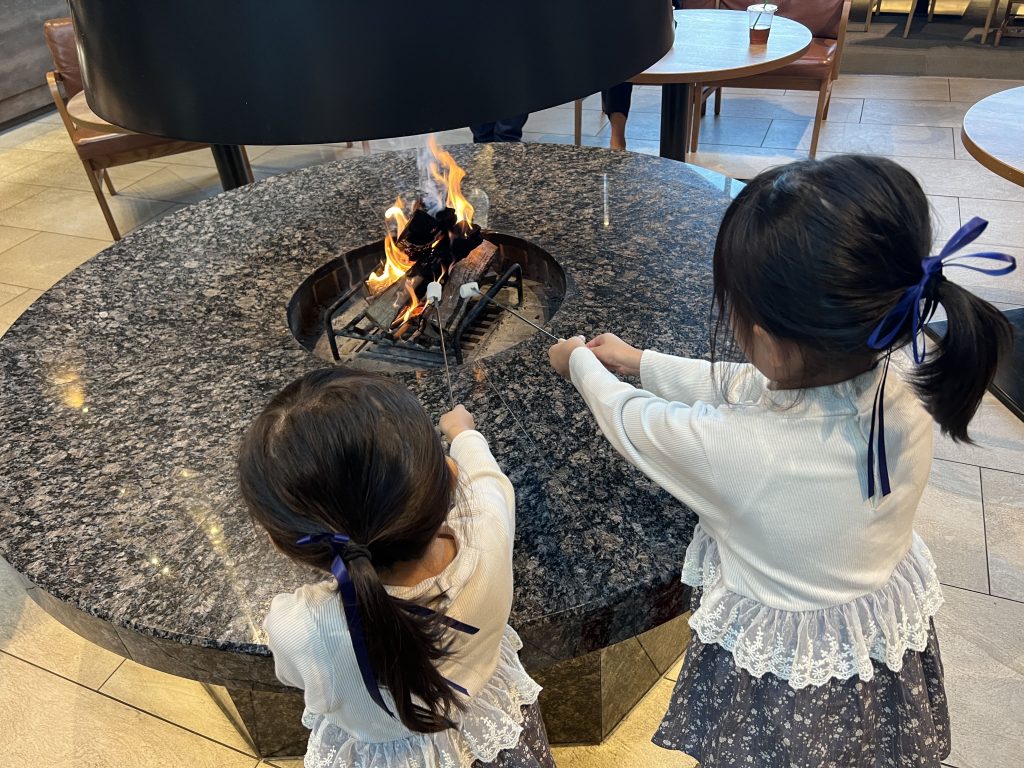 チェックイン後の16-17時には「森のキッチン」で大きな暖炉を囲んで、本格的な「マシュマロ焼き」に挑戦できます🤗焦がさないようにちょうどいい加減に焼くのが意外と難しかった!