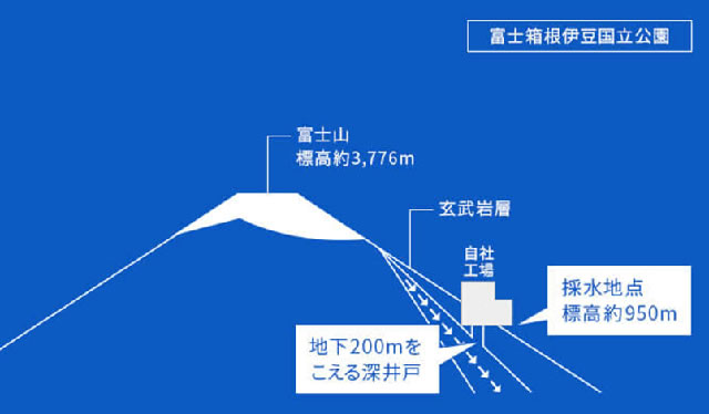 富士の湧水の天然水の採水地は富士山の北側のふもと標高約950mに自社工場を建て地下200mの深井戸からくみ上げています。
