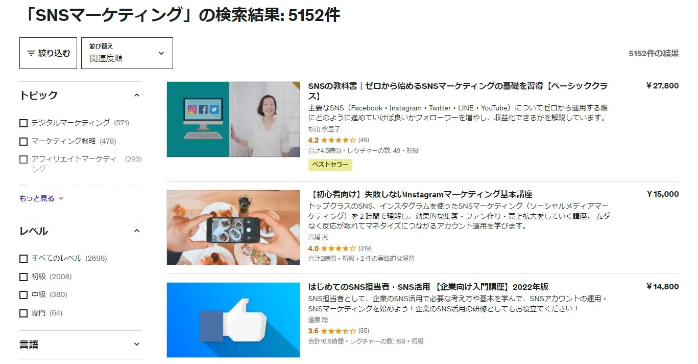 TikTok運用に関する講座は5,000件以上あります。SNS全般に関する講座もありますし、InstagramやFacebookといった個別のSNSに特化した講座もありますので自分にぴったりの講座を探してみましょう。