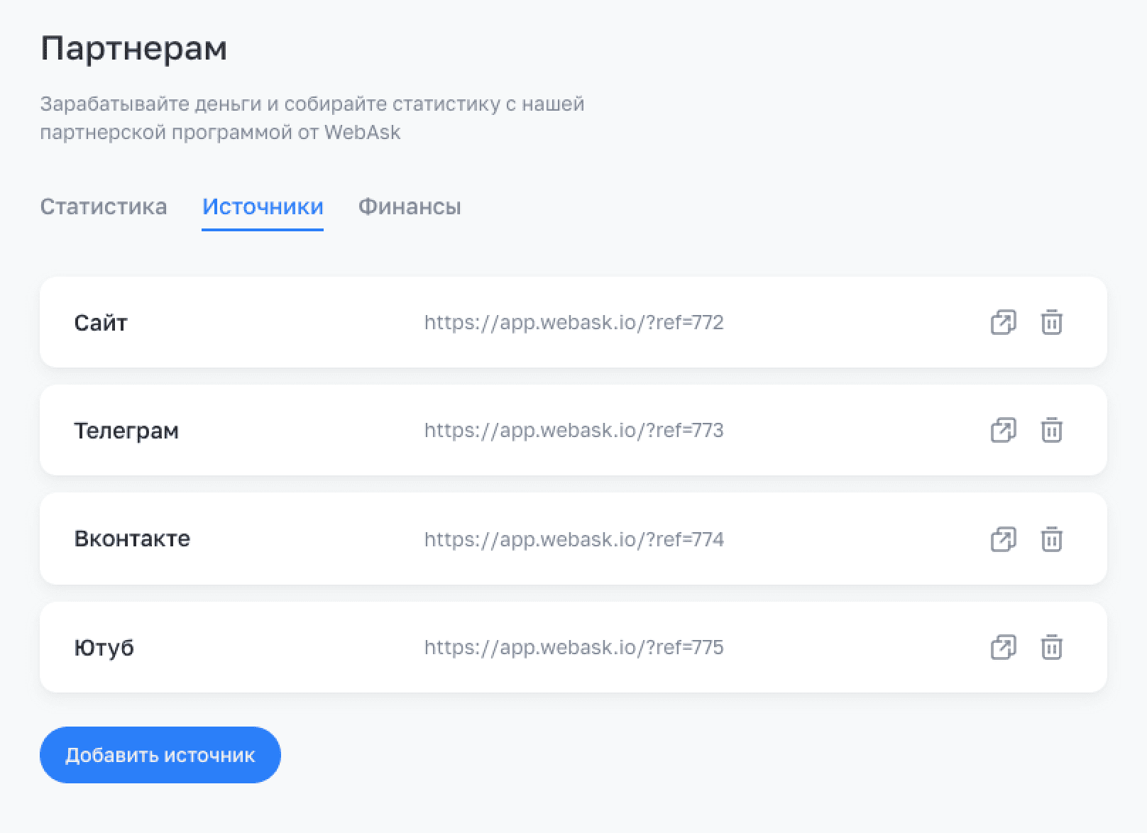 Для того, чтобы открыть страницу партнерской программы, перейдите в ваш аккаунт WebAsk — «Партнерам». После чего вы попадете на страницу со всеми параметрами вашей партнерской программы