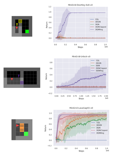 いくつかのMiniGrid環境で、通常のDDQNと学習したアルゴリズムであるDQNRegのパフォーマンスを視覚化しました。これらの環境の開始位置、壁の構成、および物体の構成は、リセットのたびにランダム化されるため、エージェントは単に環境を記憶するのではなく、一般化する必要があります。