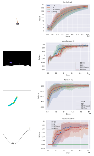 一連の古典的な制御環境では、学習したアルゴリズムは、密な報酬タスク(CartPole、Acrobot、LunarLander)で比較対象手法と一致し、よりまばらな報酬タスクであるMountainCarでDQNよりも優れています。