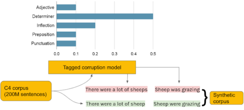 BEA-devは、さまざまな英語能力レベルをカバーするために慎重に収集されたデータセットであるため、そのエラー分布は、現実世界で実際に見られる書き込みエラーの頻度を再現している事が期待できます。次に、タグ付き破損モデル(tagged corruption model)を使用して、修正元センテンスを合成しました。