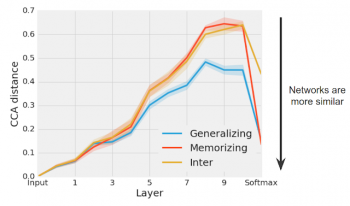我々は2種類のネットワークを複数サンプルで訓練させた。各サンプルはネットワークの初期の重みと訓練データの順序のみが異なる。そして、CCAを使った新手法(詳細は論文参照)を用いて各サンプルと一般化ネットワークと記憶化ネットワークを比較した。