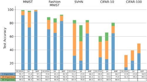 私たちの蒸留したデータセットは、画像分類データセットにおいて最先端の性能を達成し、畳み込みアーキテクチャを用いた従来の最先端モデル、「データセット凝縮(DC:Dataset Condensation)」および「差分シャム拡張を用いたデータセット凝縮(DSA:Dataset Condensation with Differentiable Siamese Augmentation)」を上回る性能を向上させました。