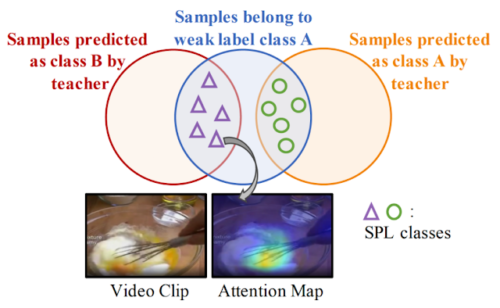 サンプリングされた学習用クリップは、トリミングされていないビデオ全体のクエリラベル(例:クッキーを焼く)とは異なる視覚的アクション(例:卵を泡立てる)を表す場合があります。SPLは、2つの関連するアクションクラスを用いて、新しい「中間」擬似クラス(すなわち、サブコンセプト)のセットを作成し、潜在的なラベルノイズを持つデータを有用な教師信号に変換します。このようにして、SPLは効果的なモデルの事前学習のために、より充実した教師を提供します。