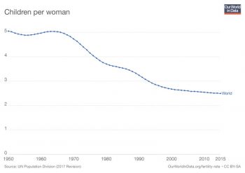 私が人口増加について覚えている統計は、今世紀に急速な人口増加が終わりに近づいている事を伝えています。過去50年間で、世界の出生率は女性1人当たりの子供5人から女性1人あたり2.5人以下に減少しています。 50年間で出生率は半減しました。