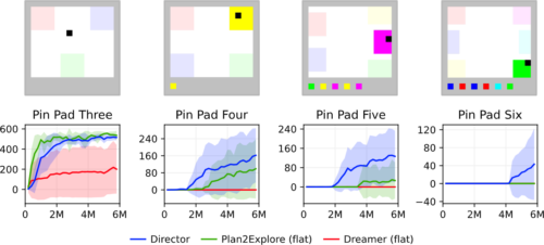 これらの課題では、エージェントは黒い正方形を操作し、それを動かして異なる色のパッドを踏みます。画面下部には、以前に起動したパッドの履歴が表示され、長期記憶の必要性を排除しています。タスクは、すべてのパッドをアクティブにするための正しい順序を発見することであり、その時点でエージェントは疎な報酬を受け取ることができます。ここでもDirectorは従来の手法を大きく上回っています。
