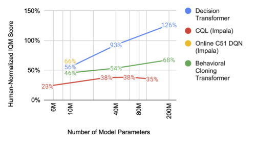 マルチゲーム・デシジョントランスフォーマーに関する私達の観察も同様で、モデルサイズが大きくなればなるほど、その性能は予測通りに向上します。特に、その性能はまだ天井に達していないようで、他の学習システムと比較すると、モデルサイズの増加に伴って性能向上がより顕著になっています。