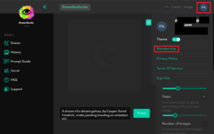 この画面で画像生成をする事が出来るのですが、今回はAPIキーを取得する事が目的なので、右上のアイコンをクリックして出てくるメニューから「Membership」を選びます。