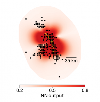そこから、本震によって引き起こされる静的な応力の変化と余震の位置関係を解析するためにディープラーニングを適用しました。そして、ディープラーニングによるアルゴリズムは有用なパターンを識別することができました。