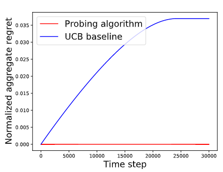 私達は、標準的なUCBアルゴリズムを使用して、ペアワイズ比較モデルに提出する2つのアームを選択するベースラインと、私達のML探索アルゴリズムを比較します。UCBを使用する比較対象手法は後悔を蓄積し続けますが、探索アルゴリズムは後悔を蓄積することなく、迅速に最良の腕を特定し、それを選択し続けることが観察されました。