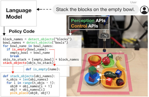 私たちは、LLMがロボットの動作を制御できるコードを書く可能性についても期待しています。コードを書くアプローチは「Robots That Write Their Own Code」で示したように、APIコールを再構成して新しいコードを自律的に生成することで、ロボットがこなすタスクの複雑さを高めることが期待できます。また、新しい機能を合成し、フィードバックループを表現することで、実行時に新しい動作を組み立てることができます。