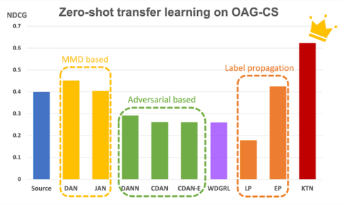 KTNの有効性を検証するため、2つの公開異種グラフであるOpen Academic GraphとPubmedで、18種類のゼロショット転移学習タスクを実行しました。KTNを8つの最先端の転移学習法(DAN, JAN, DANN, CDAN, CDAN-E, WDGRL, LP, EP)と比較しました。以下に示すように、KTNはすべてのタスクで常にすべてのベースラインを上回り、転移学習ベースラインを最大140%(ランキング指標である正規化割引累積利得(Normalized Discounted Cumulative Gain)で測定)上回りました。
