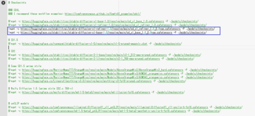 (3)Stable Diffusion XL用モデル/VAEをダウンロードする処理を追記する(青枠の行に以下を追加)