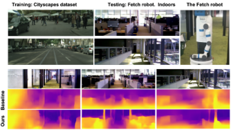 Cityscapes(移動する車から撮影した町中の風景のデータセット)で学習した学習モデルをFetch robotが屋内で撮影したデータセットでオンラインリファイメントした結果。一番下の行は、オンラインリファイメントの結果、奥行情報が洗練された事を示しています。