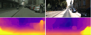 Cityscapesデータセットで学習した後にKITTIデータセットでオンラインリファイメントした結果。下段の図は、学習モデルの予測と学習モデルをオンラインリファイメントした後の奥行情報。オンラインリファイメントによって風景内の物体のアウトラインや奥行情報の精度が向上しています。