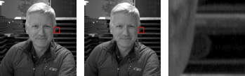 左と中央の2つのPDAF画像は非常によく似ていますが、右側の拡大図では、2つの視点間の視差を見ることができます。拡大図の中央に位置する円形部分が最もわかりやすいです。