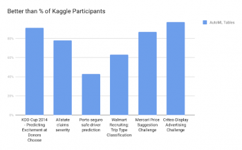 今回のコンペティションで提示されたソリューションは、Google Cloud AutoML Tablesのメインアルゴリズムです。これは、最近Google Cloud Next’19で発売されたベータ版です。AutoML Tablesの実装は、下のグラフに示すように、Kaggleの競合チームと比較したベンチマークテストで良い成績を収め、最先端のパフォーマンスを達成しています。