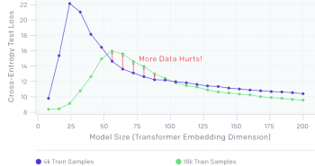 モデルのサイズが中間(赤い矢印で示されている50-100の区間)の場合、この2つの効果が組み合わされ、4.5倍以上のサンプルを使ってトレーニングをしているのにテストパフォーマンスが低下してしまう事がわかります。