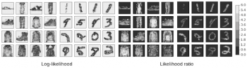 対数化した尤度ヒートマップから、「背景部分の画素」が「意味を持つ部分の画素」よりはるかに尤度に寄与している事がわかります。改めて考えてみれば、これは驚くべきことではありません。背景部分の画素はほとんどが「0」の文字列で構成されているため、非常に特徴的なパターンになり、モデルは非常に容易に特徴表現として学習してしまいます。MNISTヒートマップとFashion-MNISTヒートマップの比較は、MNISTがより高い尤度値を返す理由を示しています。MNISTには単により多くの背景部分があるのです!