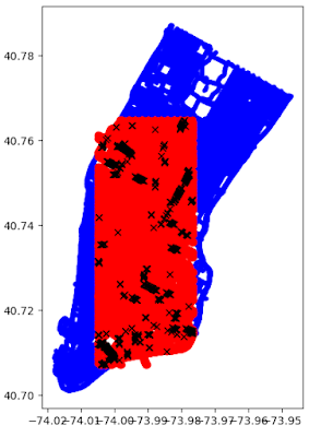別の問題は、パノラマの間隔の粒度が異なることです。以下の図は、マンハッタンのStreetLearn(青)パノラマとTouchdown(赤)パノラマが重なり具合を示しています。黒で示されている部分が両方のデータセットで同じIDを共有する(全29,641枚中の)710パノラマです。 Touchdownはマンハッタンの半分をカバーし、パノラマの密度は似ていますが、各ノードの正確な位置は異なります。
