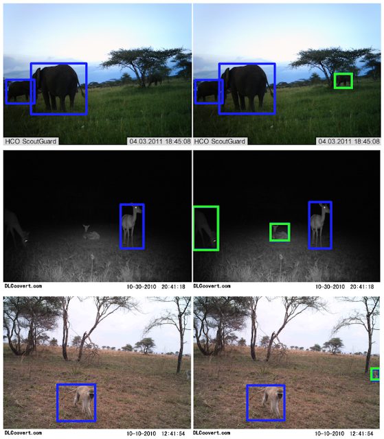 Faster R-CNN(左)とContext R-CNN(右)を比較すると、Context R-CNNは難しい物体を捕捉できています。上から木陰の象、薄明かりの中の2匹のインパラ、中心から離れたベルベットモンキー(セレンゲティ国立公園のスナップショットから引用)