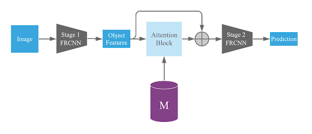 Context R-CNNでは、提案された物体をFaster R-CNNの最初の段階から取得します。それぞれについて、類似性ベースのattentionを使用して、コンテキストメモリバンク(M)の各特徴が現在の物体にどの程度関連しているかを判断します。