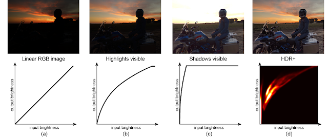 ユーザーがPixelカメラアプリでシャッターを押すと、露光不足の画像が3~15枚程度連続撮影されます。これらの画像は、シャドーのノイズを減らすために整列および併合され、風景の明るさに比例する画素値を持つ14ビットの中間「線形RGB画像」を生成します。HDR+ 画像に特徴的な外観を与えるのは、この画像を「トーンマッピング(tone mapping)」する事であり、これはつまり明るさの範囲を画面表示に適した8ビットに減らします。