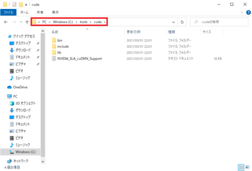 にフォルダを作って解凍したcudaフォルダを移動します。