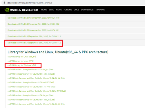 cuDNN SDKもstackoverflow.comには8.0.4で動作確認できたと言う人がいたので8.0.4を使いました。