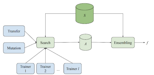 各トレーナーは独立して実行され、特定のモデルをトレーニングおよび評価します。結果は保存され、検索アルゴリズムと共有されます。次に、検索アルゴリズムは、最良のアーキテクチャの1つを変異させ、次の反復のために新しいモデルをトレーナーに送り返します。Sはトレーニングと検証の例のセットであり、Aはトレーニングと検索中に使用されるすべての候補です。