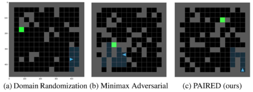 ドメインのランダム化(a)は、エージェントの学習の進行に合わせて調整されていない非構造化環境を生成します。ミニマックス敵対法(b)は、不可能な環境を作り出す可能性があります。PAIRED(c)は、挑戦的で構造化された環境を生成しますが、それでもエージェントが解決することが可能です。