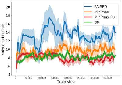 ミニマックス後悔法について興味深いのは、最初は簡単で、その後、次第に困難になるように環境を構築してカリキュラムを生成するように敵対者を動機付けることです。