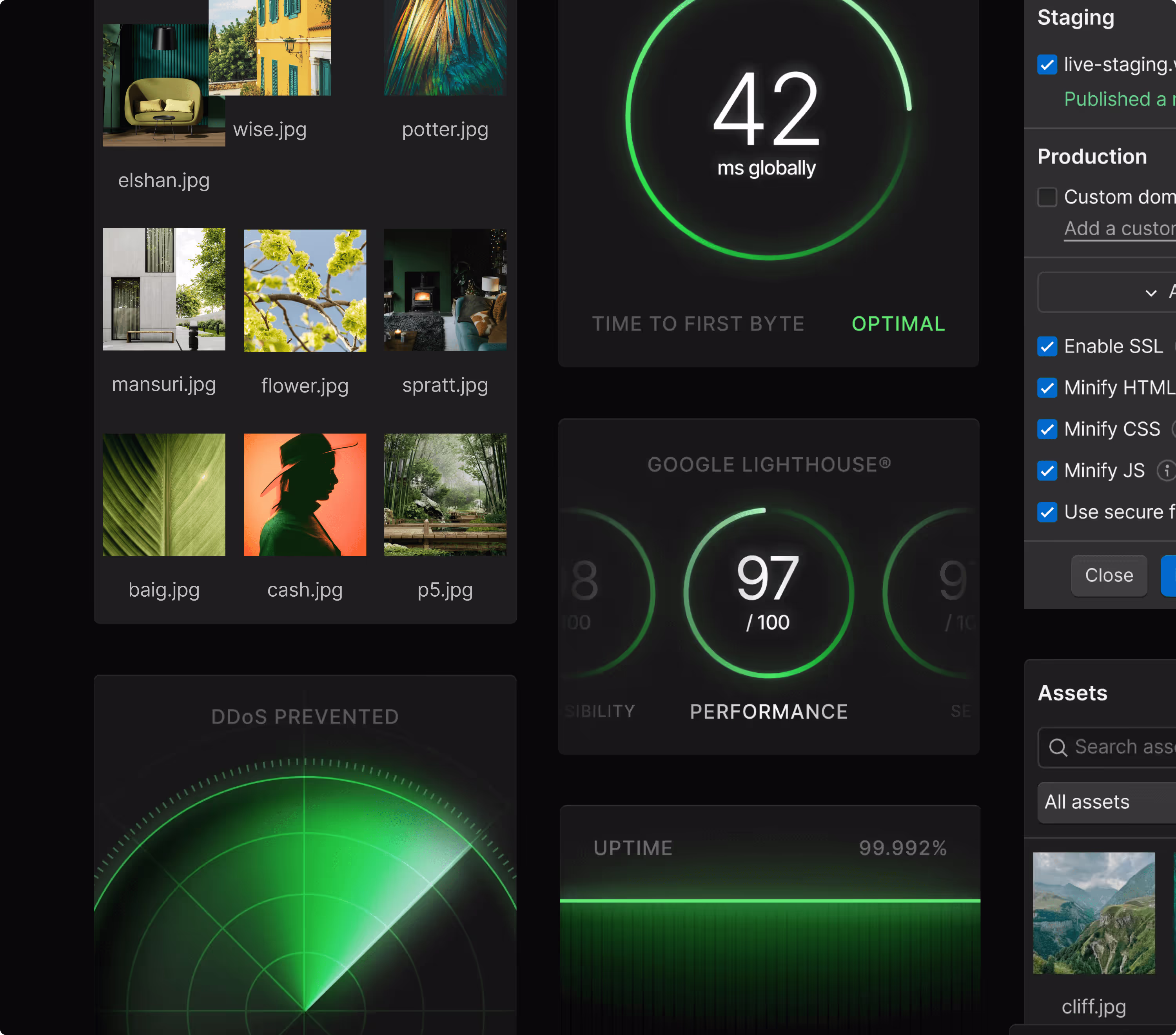 Webflow offers a fully-managed, auto-cached, instantly-deployed hosting environment that automatically serves your site from a location near each visitor. 15,000 websites are published with Webflow every hour with 99.99% hosting uptime, reaching 95% of the world in <50ms.