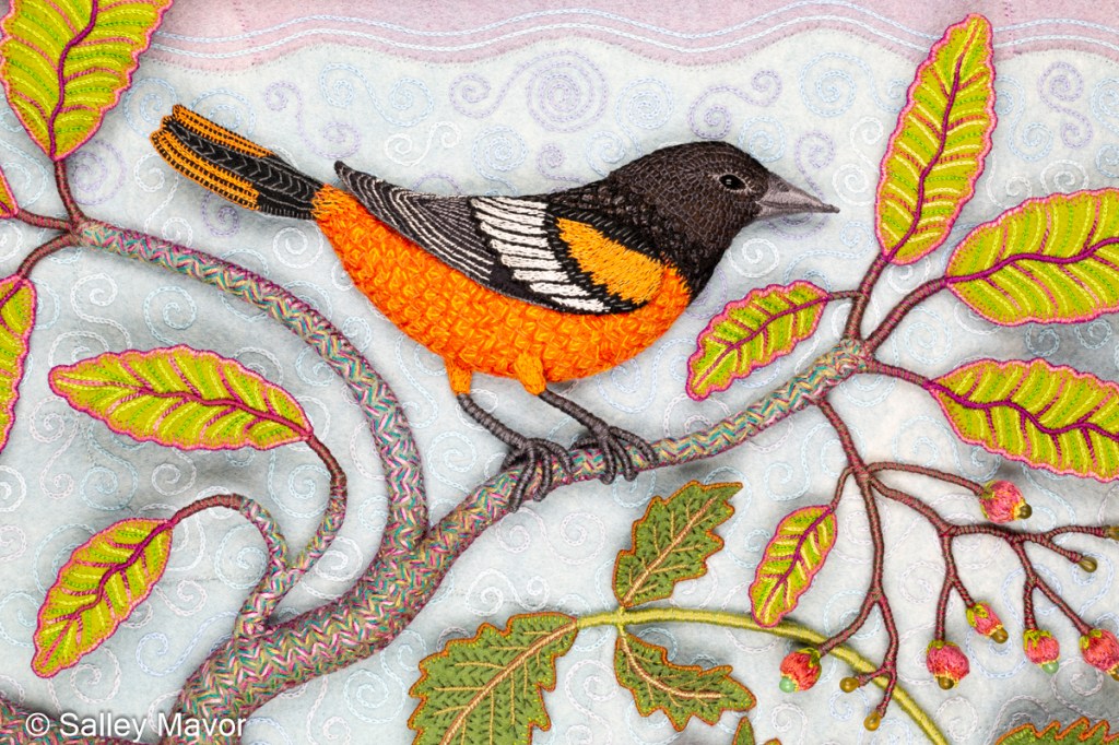 Part 8 in the series of posts about making my piece Summertime includes photos and videos documenting the process of stitching flora. For a more comprehensive understanding of my process, I encourage you to explore other posts in this series: Overview of the piece, Part 1 – Tree Trunks, Part 2 – Tree Houses, Part 3 – leaves, stems and branches, Part 4 – Baltimore Oriole (body), Part 5 – Baltimore Oriole (head and feet), Part 6 – rose vine, Part 7 – raspberry plants, Part 8 – stitching flora, Part 9 – moss, sky and stone wall, and Part 10 – wee folk.