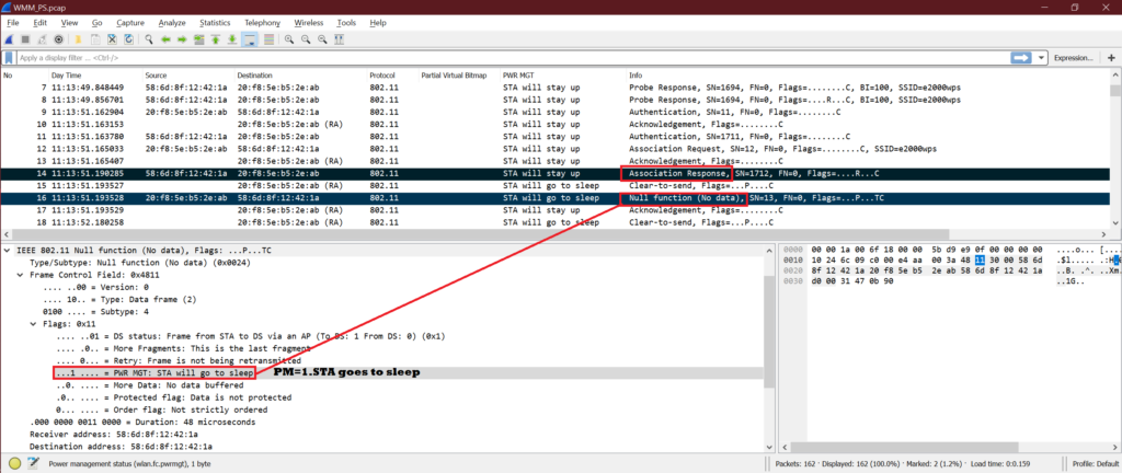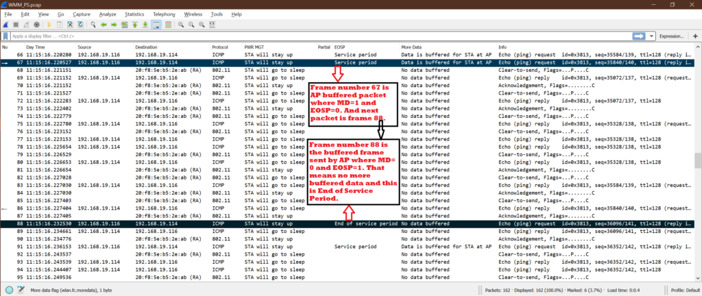 Let’s see one instance to understand point 5, 6 better. Here we can see ping request coming from AP and ping reply coming from STA. So, ping request is buffered packet.