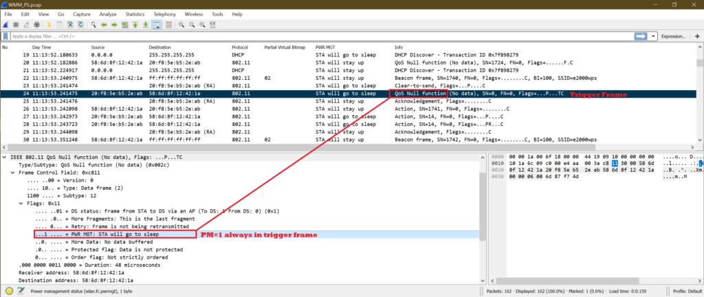 4. STA sends a trigger frame to AP. A trigger frame may be a QoS Null or Data packet. Remember that PM bit is set to 1 in trigger frame (Data or QoS Null). In general we can see trigger frame is Voice Access Category.